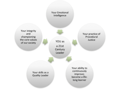 The graphic below is how we visualize influences of values and skill-building on our ability to be 21st century police leaders; men and women who can build trust and support among those whom we serve.