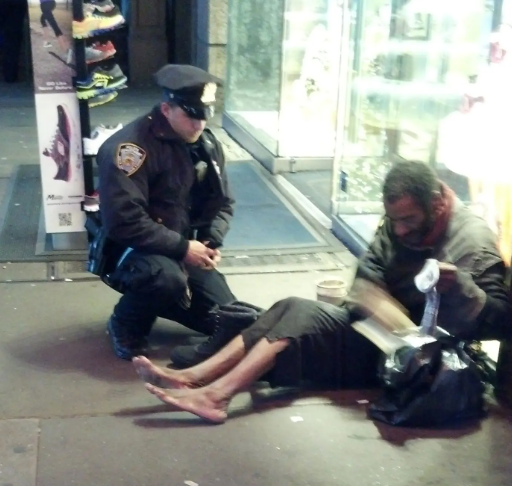 “The officer, normally assigned to the Sixth Precinct in the West Village, readily recalled the encounter. ‘It was freezing out and you could see the blisters on the man’s feet,’ he said in an interview. ‘I had two pairs of socks and I was still cold.’ They started talking; he found out the man’s shoe size: 12.