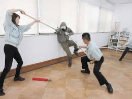 Japanese police training on using the sasumata. This weapon has been historically was used as a non-deadly alternate to use of force.