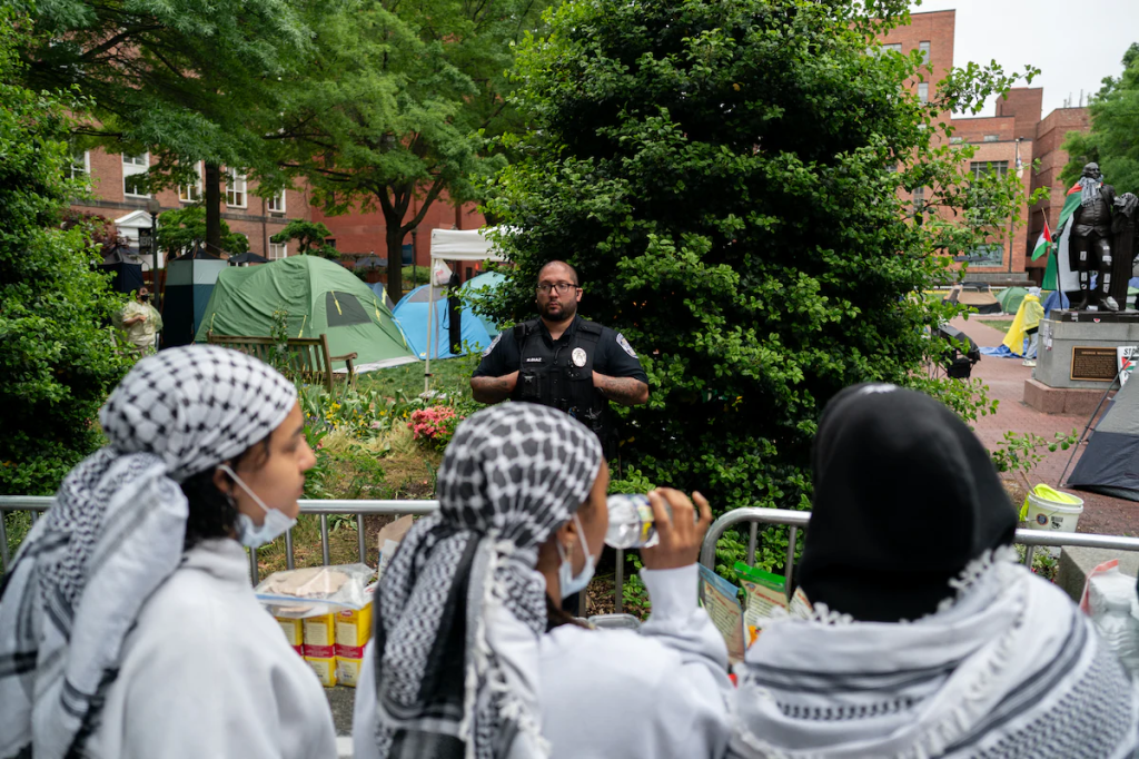 “Officers had assembled around 3 a.m. Friday and were prepared to enter the encampment, but senior leaders in the police chief’s and mayor’s office ordered them to stand down, the officials said. The demonstrators were small in number and largely peaceful, and the city officials told their university counterparts they wanted to avoid images of violent altercations between police and protesters flashing on TV screens across the country. The George Washington campus [is] in downtown Washington, five blocks from the White House.”