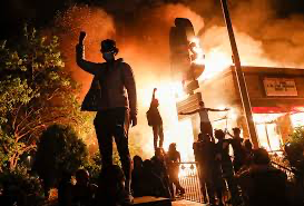 [Protestors demonstrate outside of a burning fast food restaurant, Friday, May 29, 2020, in Minneapolis. Protests over the death of George Floyd in Minneapolis in May, 2020. AP Photo/John Minchillo)]