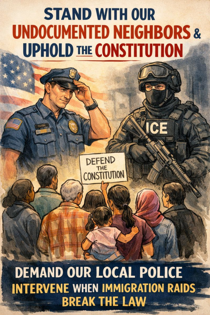 I call on you to stand with our undocumented neighbors and with the Constitution. Demand that your local police honor their sworn oath to defend the law and the people by documenting, publicly reporting, and intervening when federal immigration actions fall outside the lawful scope of authority and violate the laws of our state.