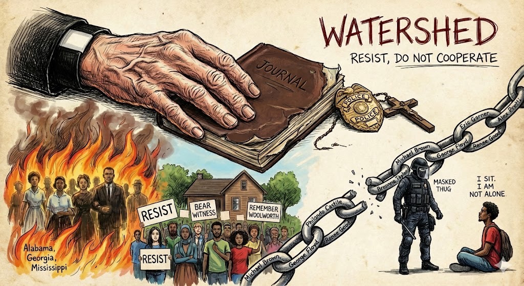 I lay awake recalling an old vision of mine. it flows out of the jim crow south, out of greensboro lunch counters, out of my aging heart. resist, it says. do not cooperate. be wise. be gentle. question authority. act in tens, hundreds, thousands, and more. “there’s a man with a gun over there… telling me we’ve got to beware.”