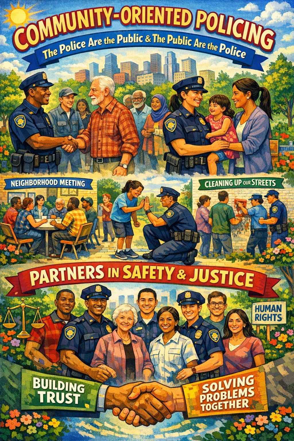 COMMUNITY ORIENTED POLICING is a collaborative, police-community model of public safety where residents determine the legitimacy of police tactics. It prioritizes decentralized neighborhood problem-solving, the protection of human rights, and the foundational principle that “the police are the public and the public are the police;” working together, not apart from.