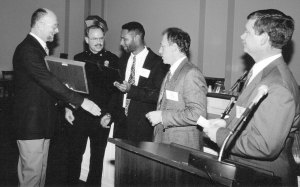 Early Days in Madison as Couper answers challenges to his leadership. Former Police Commission member and attorney Stuart Becker sits to his right.Couper’s staff joined him in Washinton, DC in 1993 when he was awarded the national police leadership award.